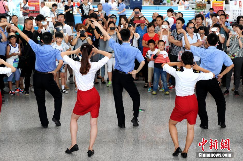 The stewards at Xi'an North Railway Station dance to "Little Apple" to welcome the passengers on Aug. 21, 2014, in Xi'an, northwest China's Shaanxi province. By the Chopsticks Brothers, "Little Apple" is one of the most popular songs in China. (Photo/CNS) |