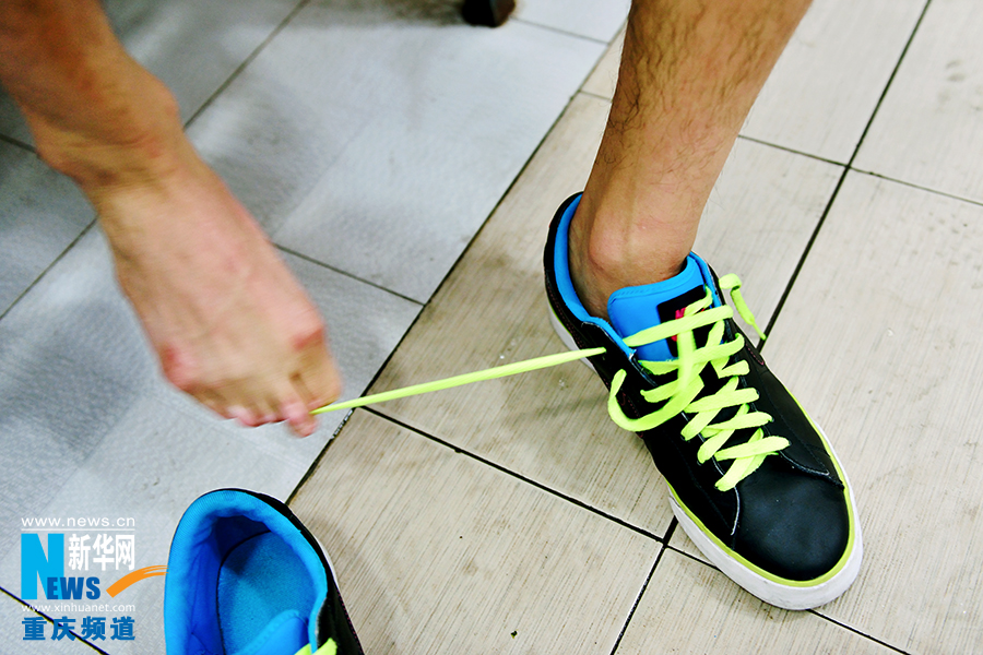 Wang Hu ties the shoes using his toes on Aug. 21, 2014. (Photo/Xinhua)