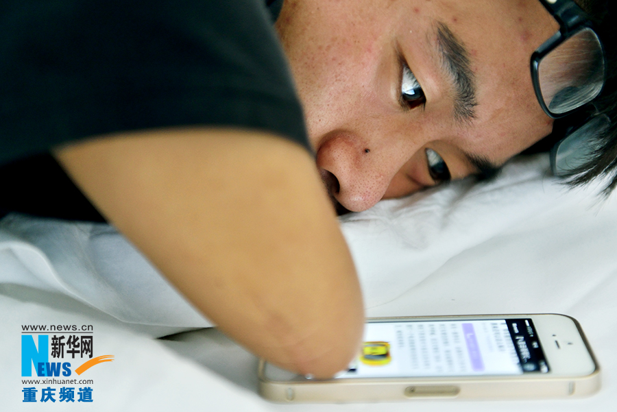 Wang Hu plays on his mobile phone on Aug. 21, 2014. (Photo/Xinhua)
