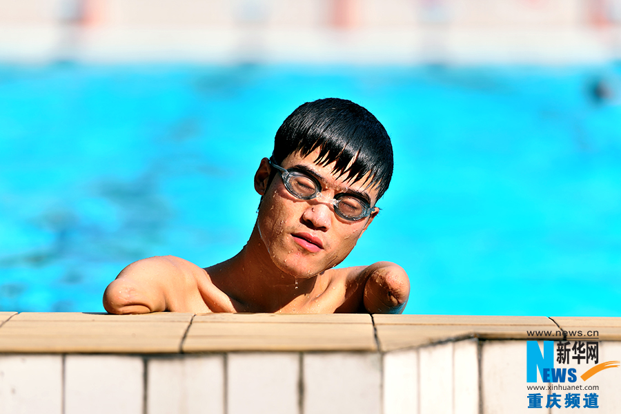 Wang Hu prepares for the swimming events of Chongqing Paralympic in the swimming pool of Southwest University in Chongqing, Southwest of China. His training has attracted the attentions of other swimmers, not only because he has no arms, but also because he swims so fast like a flying fish.