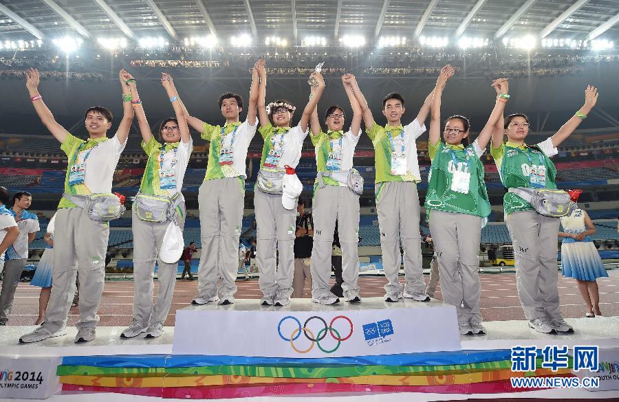 Volunteers take group photos on podium at the carnival on Aug. 25, 2014. (Xinhua/Chen Cheng)