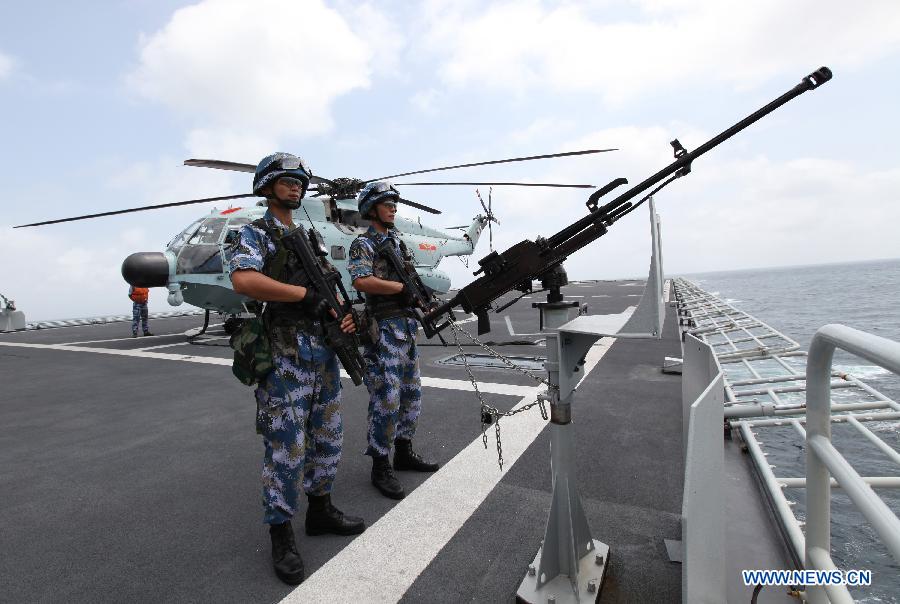 Chinese Navy soldiers observe from China's amphibious landing ship Changbaishan during an escort mission in the Gulf of Aden, Aug. 26, 2014. This is the 18th convoy fleet sent by the Chinese People's Liberation Army Navy for these missions since 2008. (Xinhua/Zhang Yuelin) |