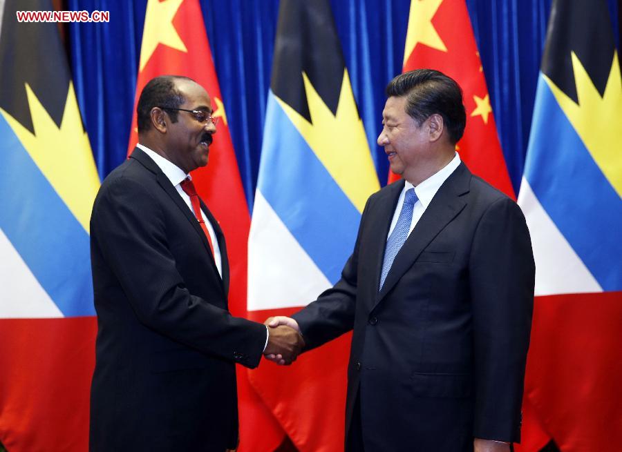 Chinese President Xi Jinping(R) meets with Gaston Browne, Prime Minister of Antigua and Barbuda, in Beijing, capital of China, Aug. 27, 2014.(Xinhua/Ju Peng)