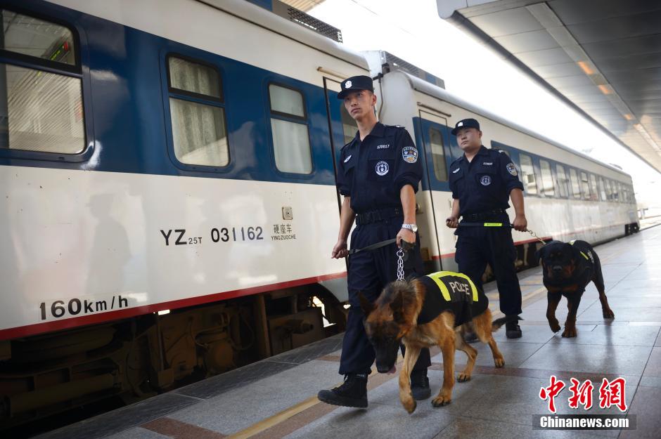 Two police dogs are on duty, searching for prohibited materials in the square of the railway station in Hohhot, capital of Inner Mongolia Autonomous Region on Aug. 26, 2014. Recently, 19 German shepherd dogs joined the police dog training team in the city. The police dogs have joined routine patrols in densely-populated areas. They are expected to help the police deal with terrorist attacks and keep order in large-scale gatherings. (China News Service/Liu Wenhua)