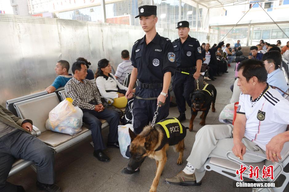 Two police dogs are on duty, searching for prohibited materials in the square of the railway station in Hohhot, capital of Inner Mongolia Autonomous Region on Aug. 26, 2014. Recently, 19 German shepherd dogs joined the police dog training team in the city. The police dogs have joined routine patrols in densely-populated areas. They are expected to help the police deal with terrorist attacks and keep order in large-scale gatherings. (China News Service/Liu Wenhua)