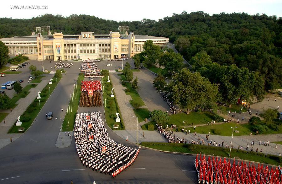 Photo provided by Korean Central News Agency (KCNA) on Aug. 27, 2014 shows members of the young vanguard attend a grand march at the Kim Il Sung Stadium, Pyongyang, the Democratic People's Republic of Korea (DPRK), to celebrate the Youth Day which falls on Aug. 28. (Xinhua/KCNA)