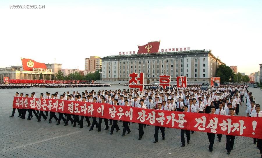 Photo provided by Korean Central News Agency (KCNA) on Aug. 27, 2014 shows members of the young vanguard attend a grand march at the Kim Il Sung Stadium, Pyongyang, the Democratic People's Republic of Korea (DPRK), to celebrate the Youth Day which falls on Aug. 28. (Xinhua/KCNA) |