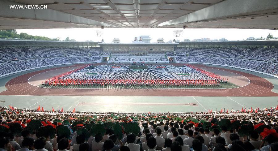 Photo provided by Korean Central News Agency (KCNA) on Aug. 27, 2014 shows members of the young vanguard attend an oath-taking ceremony at the Kim Il Sung Stadium, Pyongyang, the Democratic People's Republic of Korea (DPRK), to celebrate the Youth Day which falls on Aug. 28. (Xinhua/KCNA) |