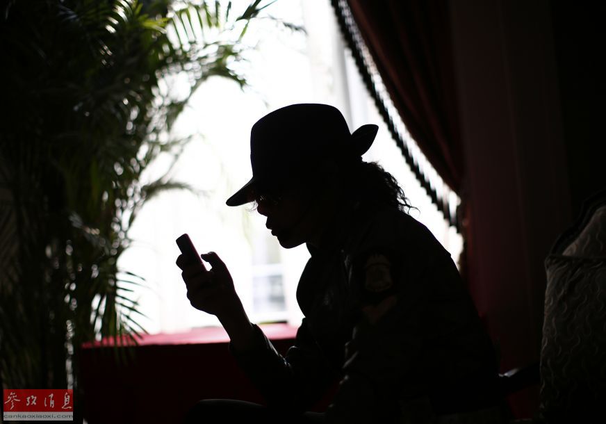 Zhang Guanhui, imitating Michael Jackson, is silhouetted as he uses his mobile phone while waiting to perform, in a dressing room in Langfang, Hebei province July 19, 2014. (Photo: cankaoxiaoxi.com)