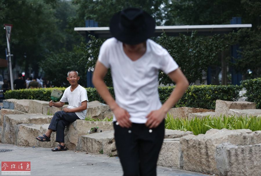 Zhang Guanhui, impersonating Michael Jackson, dances during his street performance in Beijing August 20, 2014. Zhang, born in 1984, quit elementary school and has since held jobs as a factory worker, waiter, and security guard. After watching a Michael Jackson music video four years ago for the first time, Zhang says he became fascinated and now puts on shows on the street and small stages impersonating the King of Pop. (Photo: cankaoxiaoxi.com)