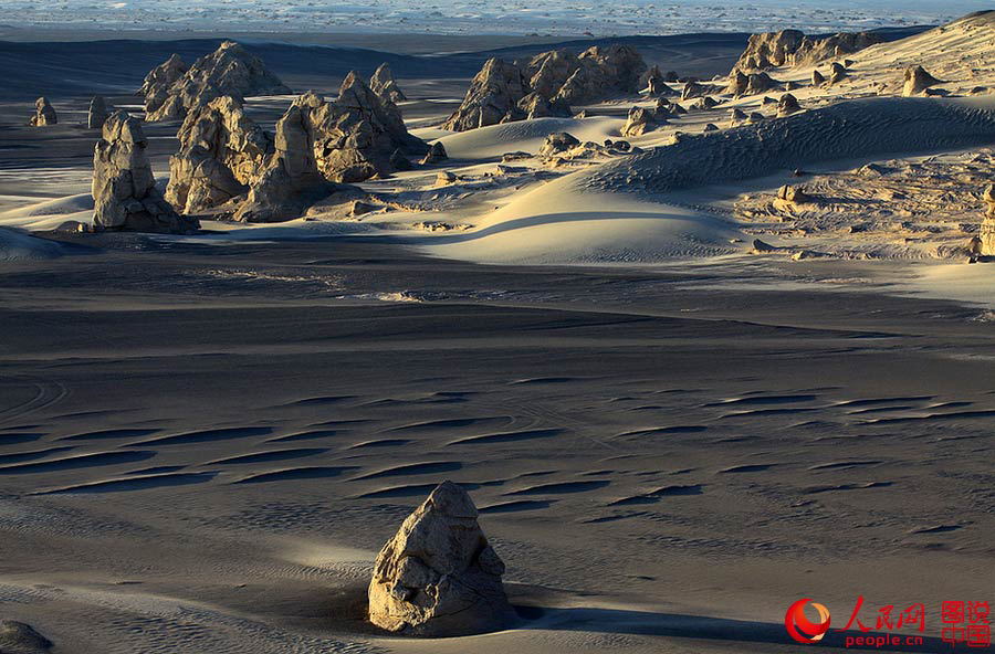 A yardang is a streamlined hill carved from bedrock or any consolidated or semi consolidated material by the dual action of wind abrasion, dust and sand, and deflation. Depending upon the winds and the composition of the weakly indurated deposits of silt and sand from which they are carved, yardangs may form very unusual shapes. (Photo/People's Daily Online)