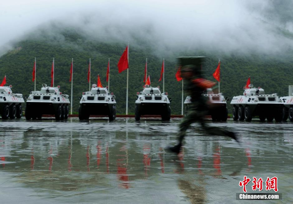Armed police compete in the rain. (CNS/Liu Zhongjun)