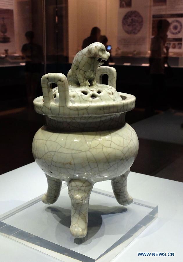Photo taken on Aug. 28, 2014 shows a displayed chinaware of Qing Dynasty (1644-1911) during an antique exhibition of the Maritime Silk Road in Jinan, capital of east China's Shandong Province. The exhibiton, displaying some 300 antiques related to the Maritime Silk Road, opened here Thursday. (Xinhua/Xu Suhui) |
