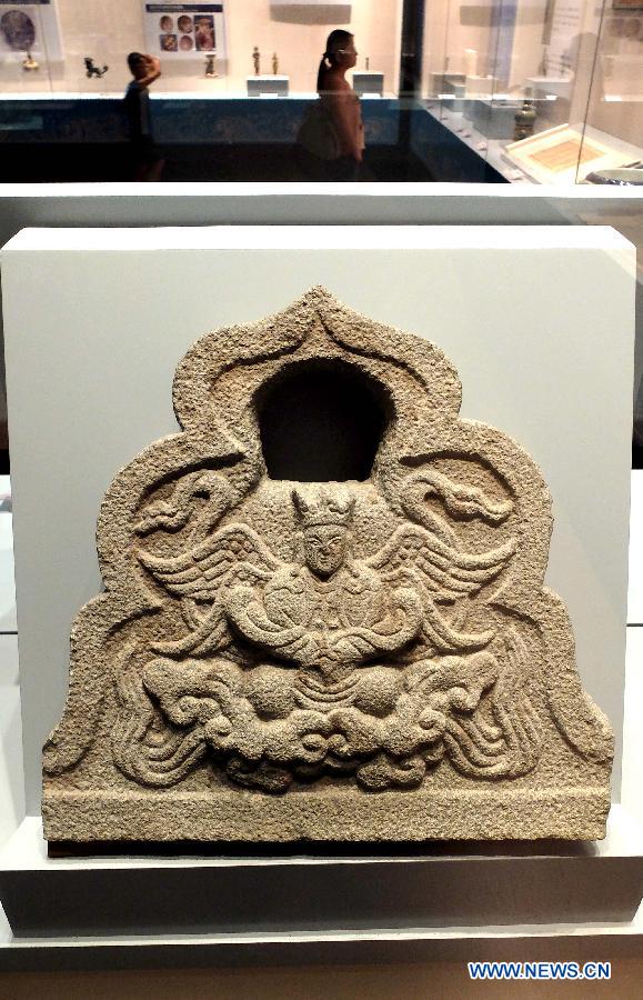 Photo taken on Aug. 28, 2014 shows a displayed stone sculpture of Yuan Dynasty (1271-1368) during an antique exhibition of the Maritime Silk Road in Jinan, capital of east China's Shandong Province. The exhibiton, displaying some 300 antiques related to the Maritime Silk Road, opened here Thursday. (Xinhua/Xu Suhui) |