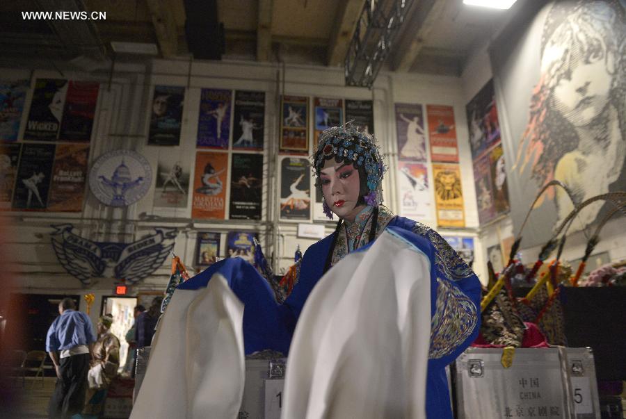 Peking Opera actor Hu Wenge prepares to perform "Lady Mu Guiying Takes Command" at the back stage of the Kennedy Center of the Performing Arts in Washington D.C., the United States, Aug. 28, 2014. Hu Wenge, student of Mei Lanfang's son Mei Baojiu, has been the only successor of male Dan, a female role in Peking Opera, in Mei school of Peking Opera for the past 50 years. (Xinhua/Yin Bogu) |