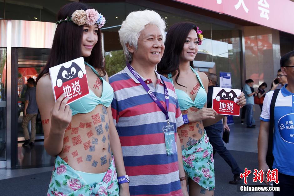 Young models with two-dimensional codes painted on their bodies attract eyes from the visitors at the China Internet Conference in Beijing, Aug. 26, 2014. More than 200 technology elites from around the world got together to discuss the topics centered around “creating opportunities for building new era’s economic engine”, which includes fields such as mobile Internet, Internet banking, wearable devices, smart TVs, smart transportation, big data, cloud computing, and e-commerce. (CNS/Han Haidan)