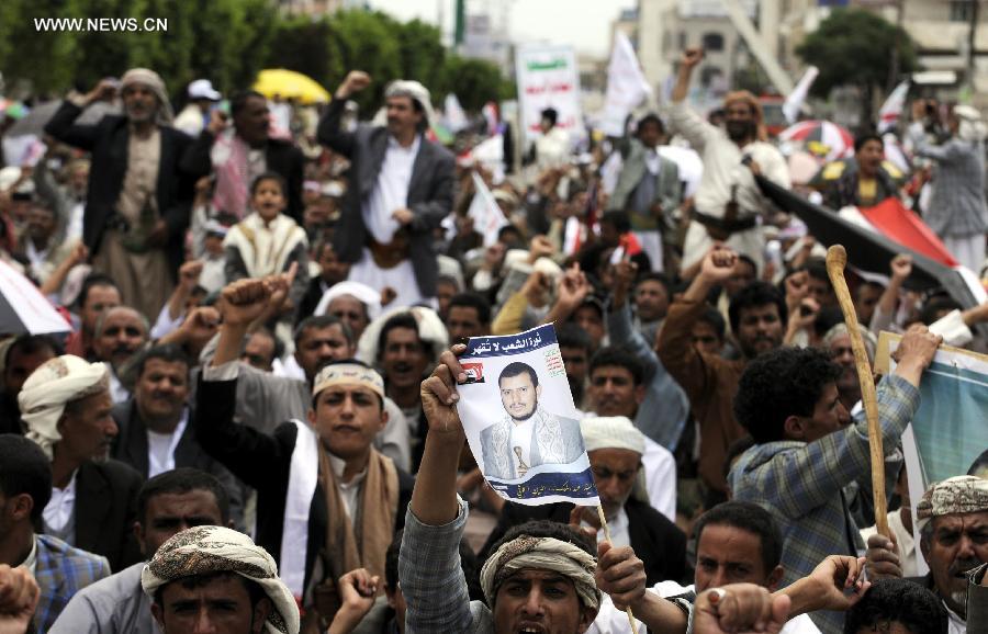 Yemeni anti-government protesters shout slogans during a mass rally in Sanaa, Yemen, on Aug. 29, 2014. Hundreds of thousands of pro- and anti-government Yemenis staged demonstrations across the country on Friday, as fresh crisis triggered by steep fuel price hike escalates in the impoverished country. (Xinhua/Mohammed Mohammed) |