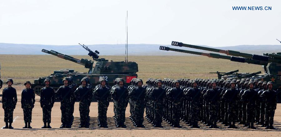 Chinese soldiers attend the closing ceremony of the Peace Mission - 2014 military drill in Zhurihe, Inner Mongolia, north China, Aug. 29, 2014. The drill, involving over 7,000 personnel from China, Russia, Kazakhstan, Kyrgyzstan and Tajikistan, member countries of the Shanghai Cooperation Organization (SCO), and expected to hone multilateral decision-making, sharpen joint anti-terror efforts and boost intelligence sharing to ensure regional peace and stability, ended here Friday along with the first edition of the SCO military tattoo. (Xinhua/Zhang Ling) |