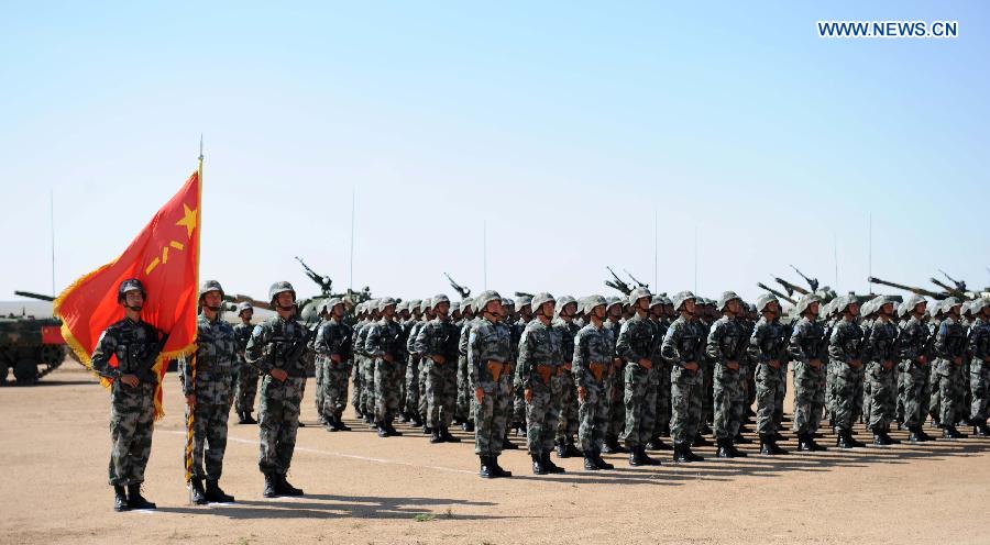 Chinese soldiers attend the closing ceremony of the Peace Mission - 2014 military drill in Zhurihe, Inner Mongolia, north China, Aug. 29, 2014. The drill, involving over 7,000 personnel from China, Russia, Kazakhstan, Kyrgyzstan and Tajikistan, member countries of the Shanghai Cooperation Organization (SCO), and expected to hone multilateral decision-making, sharpen joint anti-terror efforts and boost intelligence sharing to ensure regional peace and stability, ended here Friday along with the first edition of the SCO military tattoo. (Xinhua/Zhang Ling) |