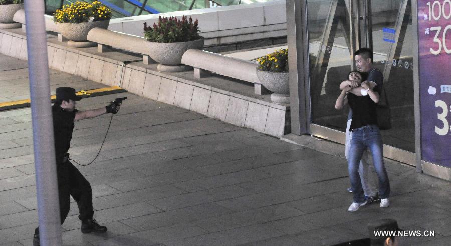 Policemen attend an anti-terrorism drill named "One-minute Handling" at the commercial district of Xidan in Beijing, capital of China, Aug. 29, 2014. (Xinhua/Li Wen)