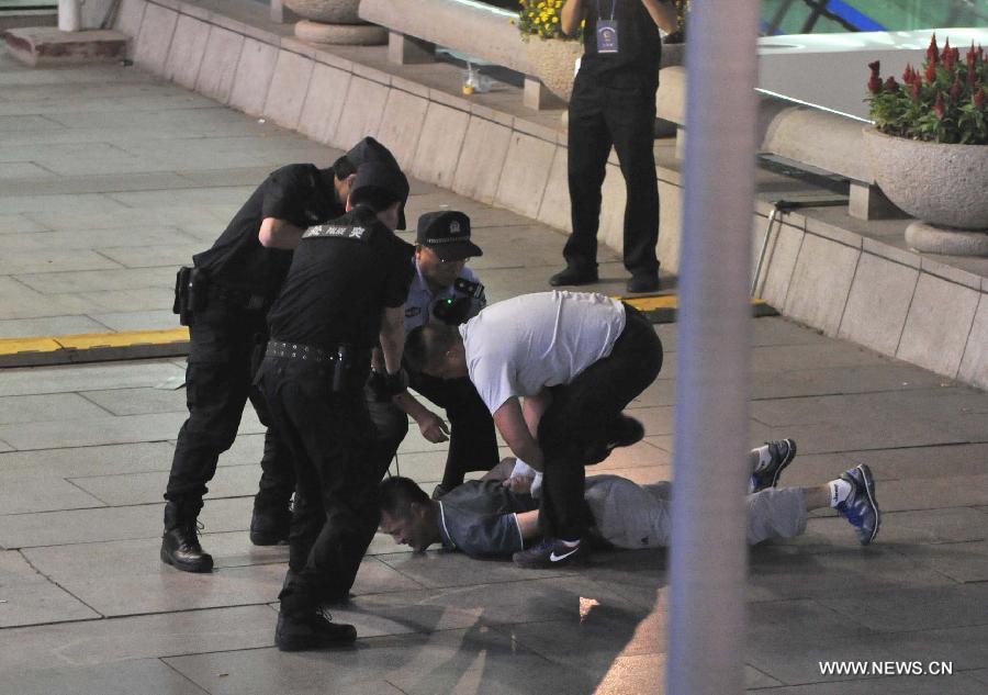 Policemen attend an anti-terrorism drill named "One-minute Handling" at the commercial district of Xidan in Beijing, capital of China, Aug. 29, 2014. (Xinhua/Li Wen)