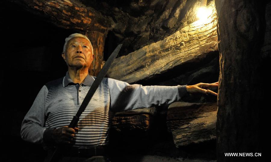 Liu Qixiang, who is a surviving forced miner working for Japan during the World War II, recalls the past at a museum of Liaoyuan miners' tomb during Japanese occupation in Liaoyuan, northeast China's Jilin Province, Aug. 28, 2014. The miners'tomb, which keeps 197 forced miners' remains, was an important evidence of Japanese crime of using forced Chinese labor between 1931 and 1945. No more than twenty of the forced miners in Liaoyuan are still alive today. (Xinhua/Wang Haofei) |