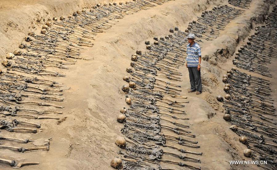 Sun Yuanxin, who is a surviving forced miner working for Japan during the World War II, looks at the remains of miners at a museum of Liaoyuan miners' tomb during Japanese occupation in Liaoyuan, northeast China's Jilin Province, Aug. 28, 2014. The miners'tomb, which keeps 197 forced miners' remains, was an important evidence of Japanese crime of using forced Chinese labor between 1931 and 1945. No more than twenty of the forced miners in Liaoyuan are still alive today. (Xinhua/Wang Haofei) |