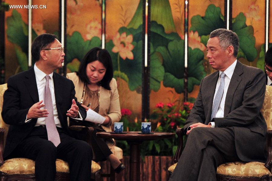 Singapore' s Prime Minister Lee Hsien Loong (R) meets with China' s State Councillor Yang Jiechi at Singapore' s Istana on Aug 29, 2014. Yang Jiechi is on a three-day official visit in Singapore. (Xinhua/Then Chih Wey)