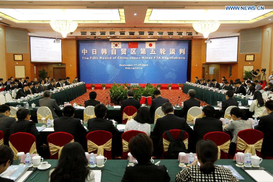 The fifth round of China-Japan-Korea FTA negotiations is held in Beijing, capital of China, Sept. 1, 2014. The fifth round of trilateral talks on the free trade agreement (FTA) among China, Japan and South Korea started on Monday and will last till Sept. 5th. (Xinhua/Xing Guangli) |