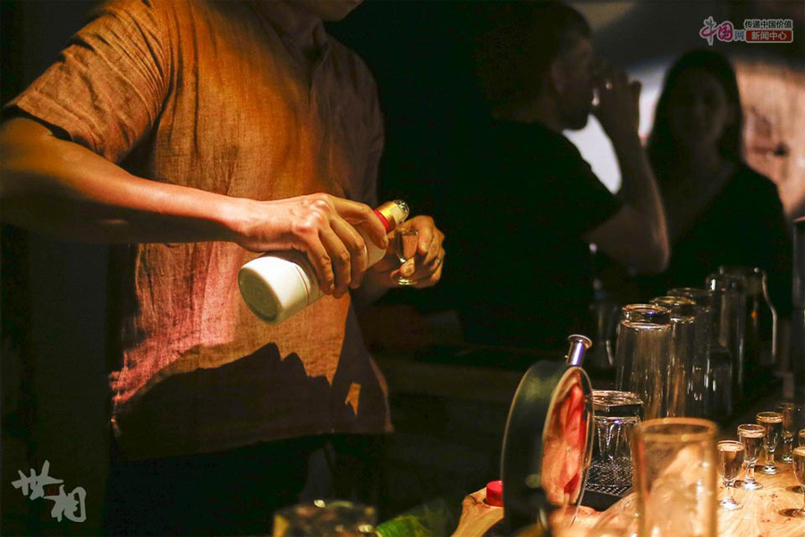Dang is pouring Moutai. At the bar, Moutai is only a drink, instead of an advanced alcohol.(china.org.cn/ Zhang Hao)