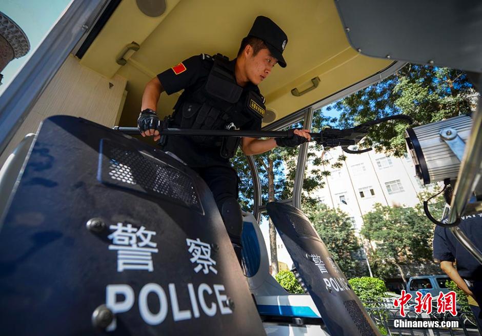A new type of anti-terrorism electric patrol car is seen on street in Urumqi, capital of northwest China's Xinjiang Uygur Autonomous Region on Aug. 28, 2014. The electric-powered car is installed with advanced equipment such as police searchlight and real-time monitoring device. (Photo/ Liu Xin) |