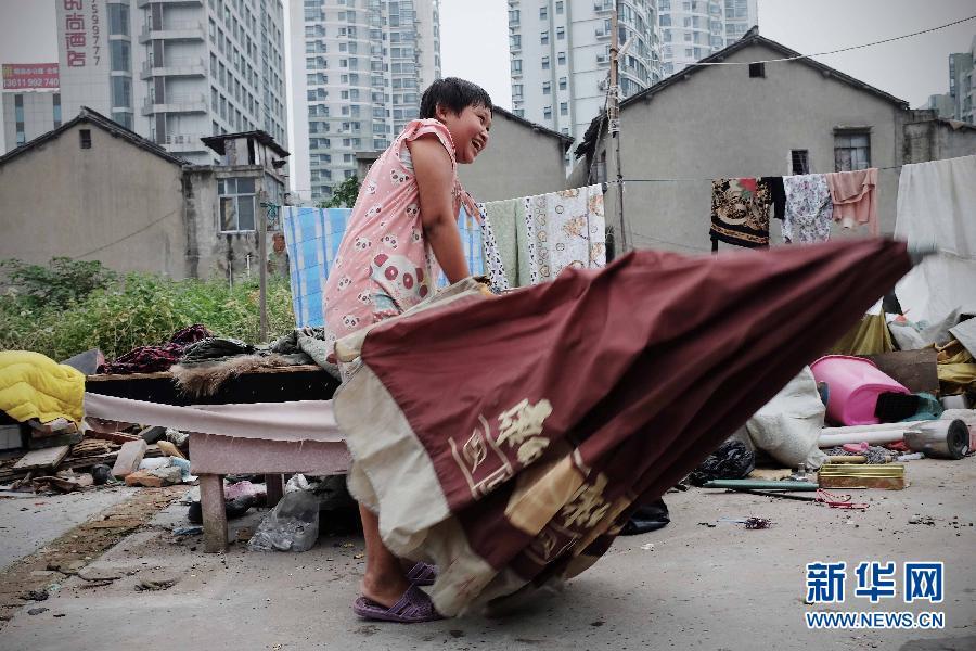 Liu Jing moves a big umbrella her parents picked, Aug. 24, 2014. (Xinhua News Agency/ Lai Xinlin)