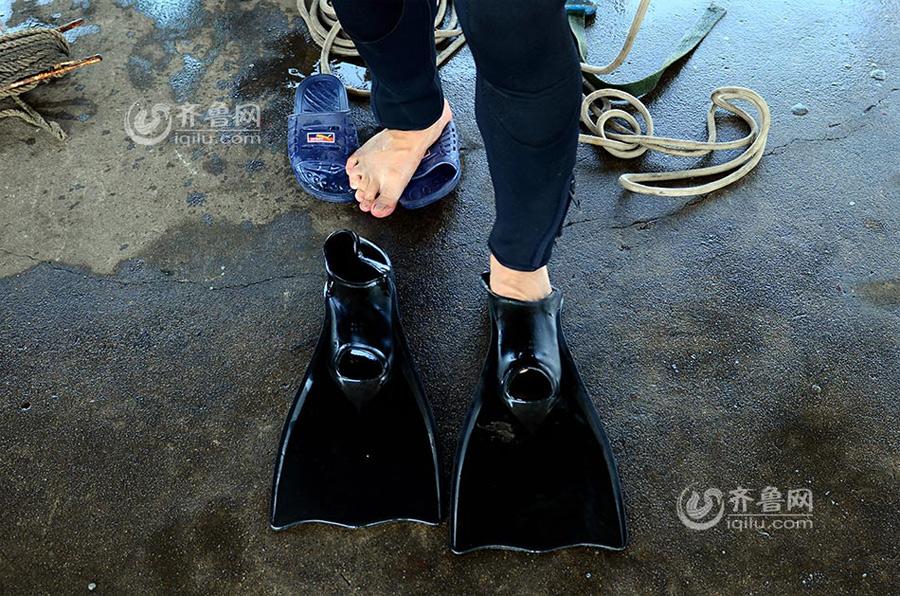 A diver equips himself with diving gear, preparing to take diving training. (iqilu.com/ Sun Zhiwen) The average training time for a soldier is about seven hours a day, and about half of it is used for underwater training where they have to endure great water pressure and combat the effect of fatigue brought by exercises.