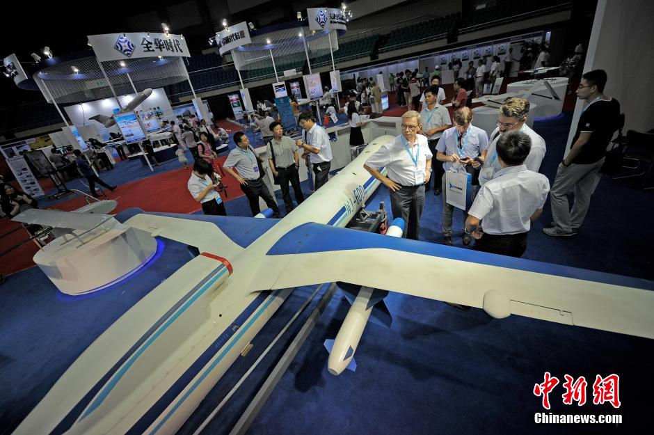 2014 International drones and model aircraft technology and equipment exhibition kicks off in north China's Tianjin on Aug. 29, 2014. More than 70 enterprises from home and abroad specializing in drone research and manufacture participate in the exhibition with advanced products including GPS, telecommunication products etc. This exhibition aims to establish an all-around communication platform and to promote integrated military and civilian development. (CNS/Tong Yu) |