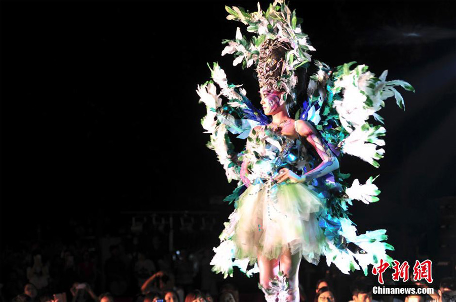 Models show makeup designs on the runway. (China News Service/ Zhang Yong)