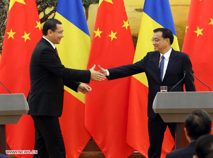 Chinese Premier Li Keqiang (R) and Romanian Prime Minister Victor Ponta attend a joint press conference after their talks in Beijing, capital of China, Sept. 1, 2014. (Xinhua/Liu Weibing)