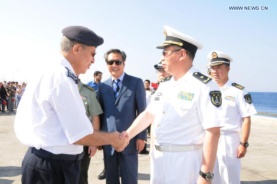 Chinese fleet director Huang Xinjian (R) is welcomed by Jordanian navy officials in Akaba, Jordan, Sept. 1, 2014. The 17th Chinese escort naval fleet, which has just finished its mission in the Gulf of Aden and Somali waters, arrived at Akaba for a 4-day visit Monday. This is the first-ever visit of Chinese warships to Jordan. (Xinhua/Jiang Shaoqing) |