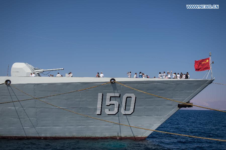 Chinese and Jordanian people visit Changchun warship in Akaba, Jordan, Sept. 1, 2014. The 17th Chinese escort naval fleet, which has just finished its mission in the Gulf of Aden and Somali waters, arrived at Akaba for a 4-day visit Monday. This is the first-ever visit of Chinese warships to Jordan. (Xinhua/Pan Chaoyue) |