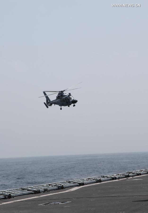 An acute appendicitis patient is transferred from Chinese navy's Yuncheng warship to Changbaishan warship by helicopter on the sea on Aug. 30, 2014. The 18th Chinese escort naval fleet made a successful operation for an acute appendicitis on Aug. 31. It is the first operation for the fleet. The patient is a crew member of Yuncheng warship. The Chinese fleet is in an escort mission in the Gulf of Aden and Somali waters. (Xinhua/Zhang Yuelin)