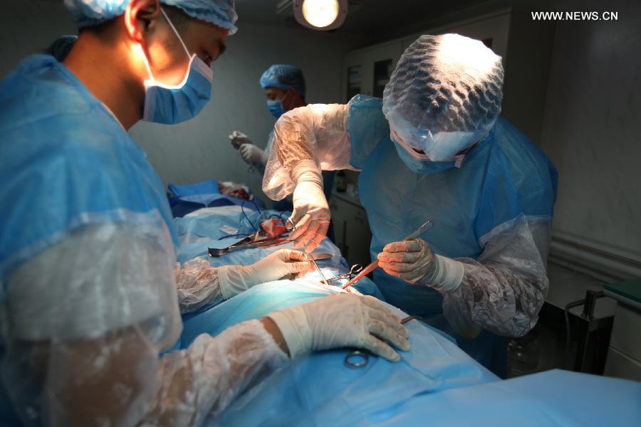 Doctors make an operation on Chinese navy's Changbaishan warship on the sea on Aug. 31, 2014. The 18th Chinese escort naval fleet made a successful operation for an acute appendicitis on Aug. 31. It is the first operation for the fleet. The patient is a crew member of Yuncheng warship. The Chinese fleet is in an escort mission in the Gulf of Aden and Somali waters. (Xinhua/Zhang Yuelin)
