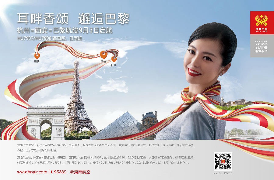 The flights will be undertaken by Airbus A330, a luxurious airliner. The airplane will land at Charles de Gaulle Airport. The scheduled flight will have a flight number of HU7907 as the airplane takes off from Xi'an at 01:40 and arrives in Paris at 7:35. The return flight will have a flight number of HU7908 as the airplane takes off from Paris at 14:25 and arrives in Xi'an at 7:00 (all times are expressed in local-time terms).