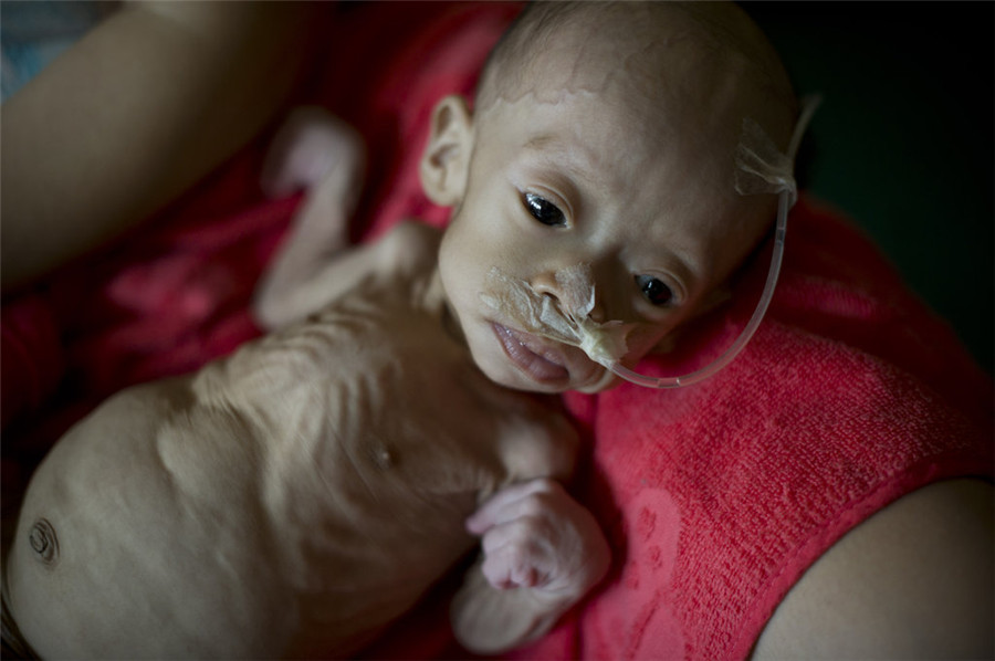 Yuanyuan is just as big as a new born baby. Her hands always curl up and her bone deforms. Besides, she can’t sit, turn over, climb, let alone stand and walk. She can only express her ideas through eyes. She sometimes laughs, sadly unable to utter voice. (Photo/Haiwainet.cn) |