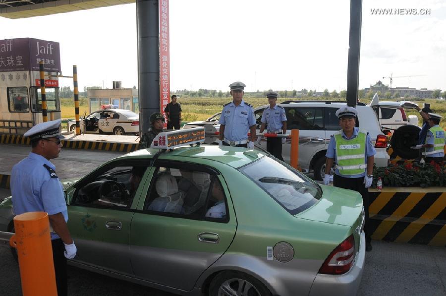 Police check vehicles at a tollgate on a highway in northeast China's Heilongjiang Province, Sept. 2, 2014. Three inmates are at large after killing a guard in a detention center in Yanshou County near the provincial capital city of Harbin early on Tuesday. Police in Heilongjiang said anyone who provides tips leading to the capture of an escapee will receive 100,000 yuan (about 16,200 U.S. dollars). (Xinhua/Liang Shubin)