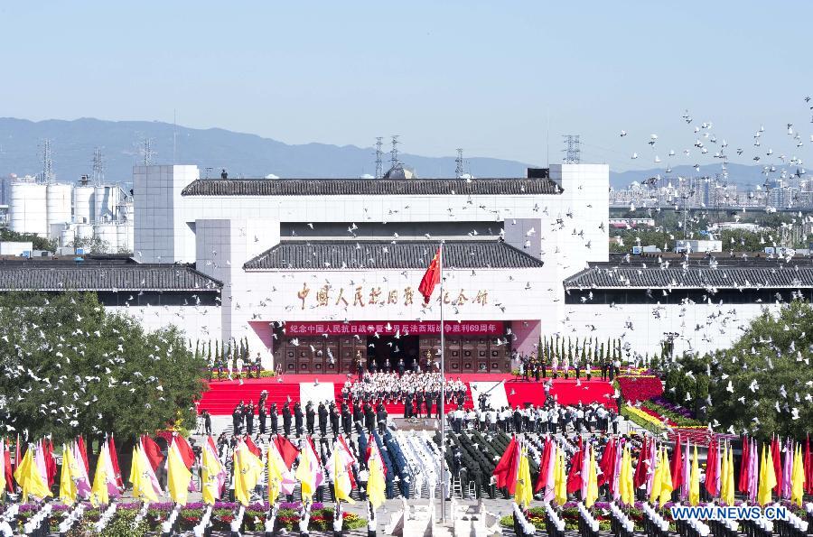 A commemoration marking the 69th anniversary of the victory of the Chinese People's War of Resistance Against Japanese Aggression, is held at the Museum of the War of Chinese People's Resistance Aganist Japanese Aggression, in Beijing, capital of China, Sept. 3, 2014. (Xinhua/Ding Lin) |