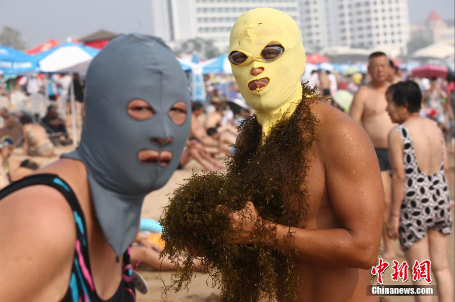 A 'facekini' man goes on shore holding a pile of seaweeds. 'It can be used in bun-making,' he said, July 13, 2011. (China News Service/Xu Chongde)