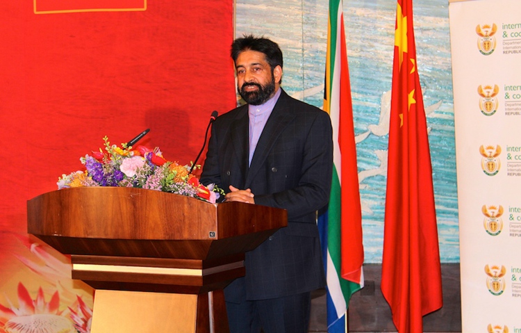 DDG Amb. Anil Sooklal of DIRCO of S.A., addresses the event held on the Open Day in China's Embassy to South Africa in Pretoria on Aug. 29, 2014.