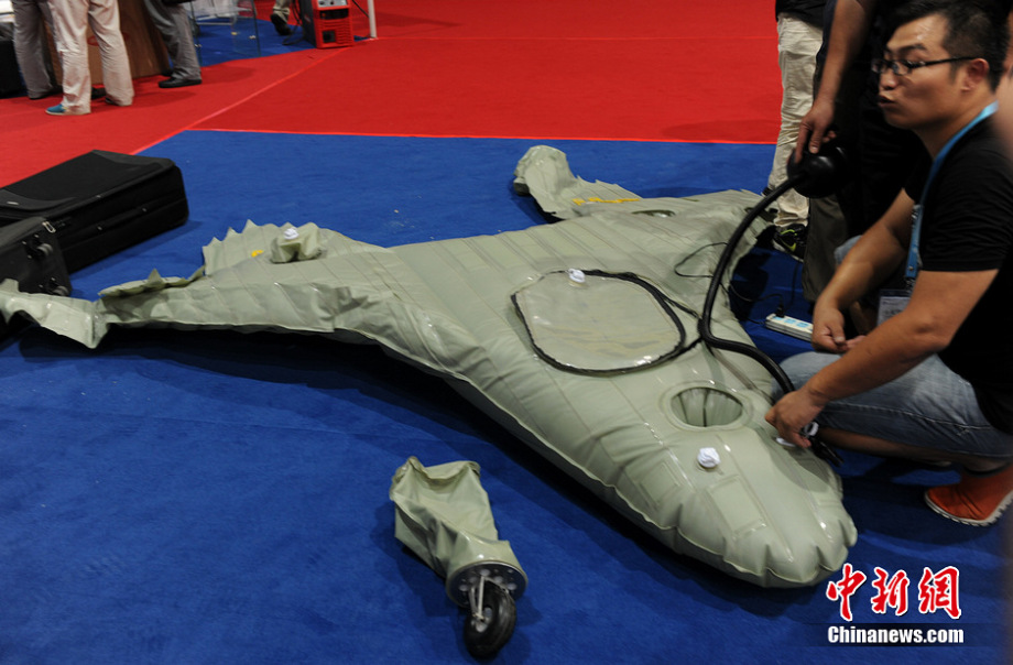 An inflatable aircraft meets the public at Tianjin International UAV Exhibition on Aug. 29 2014. Inflatable aircraft is the aircraft without rigid skeleton. Comparing with normal aircraft, it has big load capacity, good flexibility and high impact resistance. It can be used for low speed and low altitude navigation, aerial survey and remote sensing. (CNS/Chen Haifeng) |