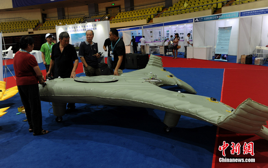 An inflatable aircraft meets the public at Tianjin International UAV Exhibition on Aug. 29 2014. Inflatable aircraft is the aircraft without rigid skeleton. Comparing with normal aircraft, it has big load capacity, good flexibility and high impact resistance. It can be used for low speed and low altitude navigation, aerial survey and remote sensing. (CNS/Chen Haifeng)