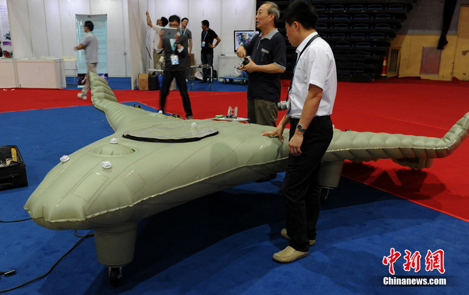An inflatable aircraft meets the public at Tianjin International UAV Exhibition on Aug. 29 2014. Inflatable aircraft is the aircraft without rigid skeleton. Comparing with normal aircraft, it has big load capacity, good flexibility and high impact resistance. It can be used for low speed and low altitude navigation, aerial survey and remote sensing. (CNS/Chen Haifeng)