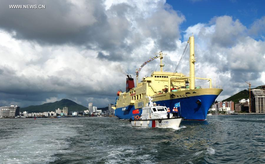 Coconut Princess, a cruise ship, leaves the port of Sanya for the Xisha Islands in south China's Hainan province on Sept. 2, 2014. The cruise trip between Sanya and Xisha was officially launched on Tuesday. The ship offers tourists a four-day, three-night cruise to Xisha, which has more than 40 islets and reefs. (Xinhua/Zhao Yingquan)